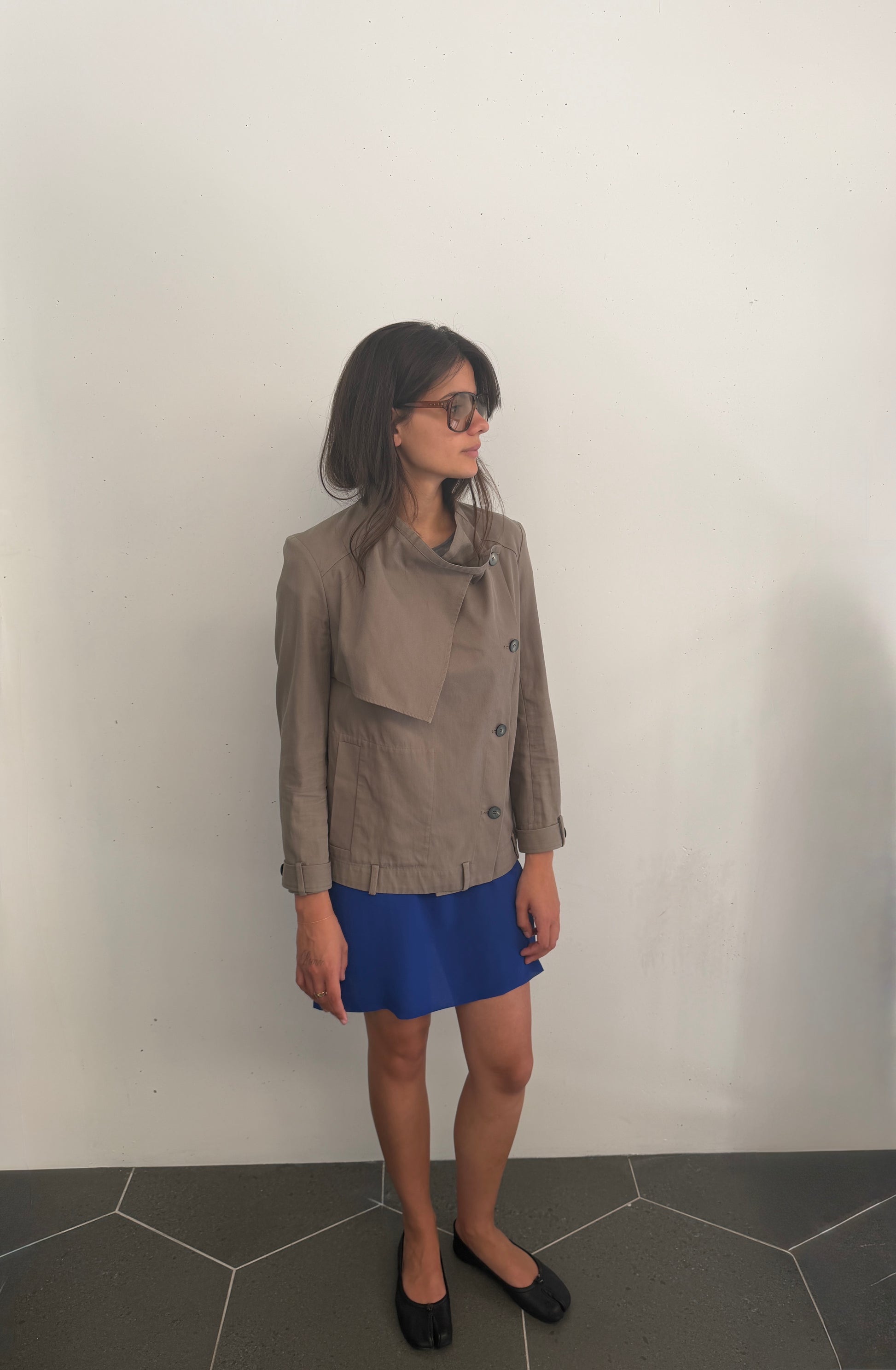 > HELMUT KHAKI ASYMETRICAL DRAPED UTILITY JACKET