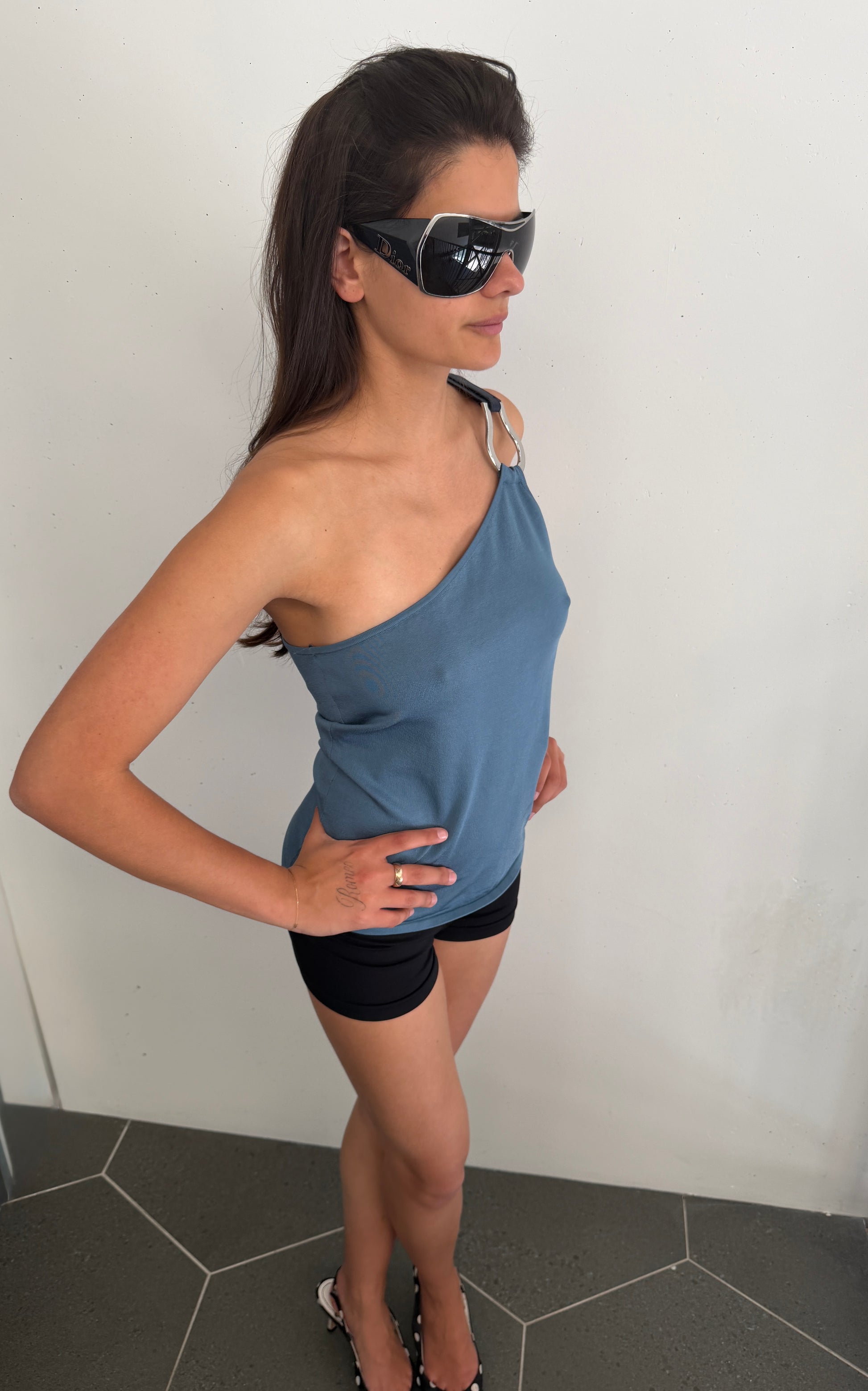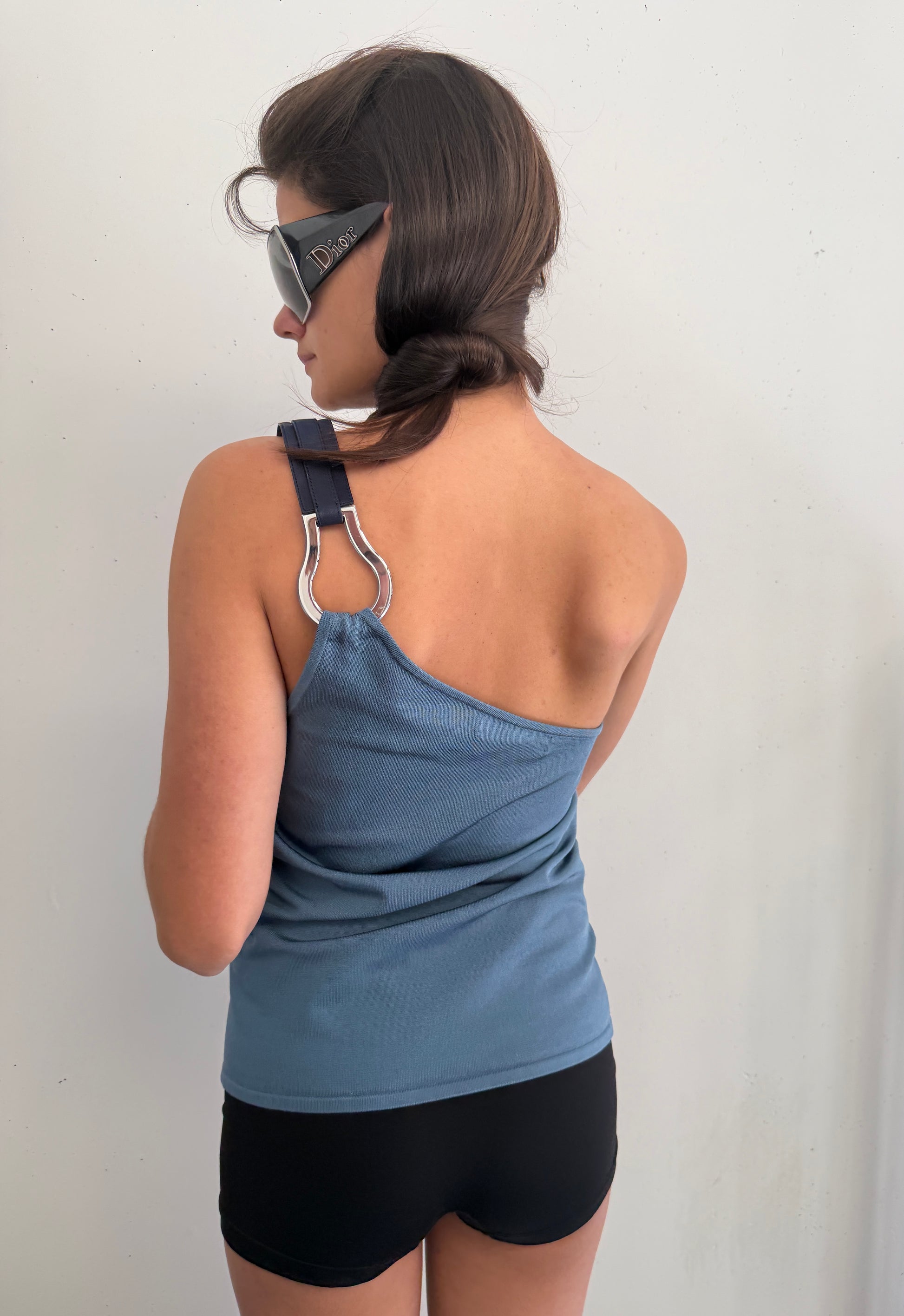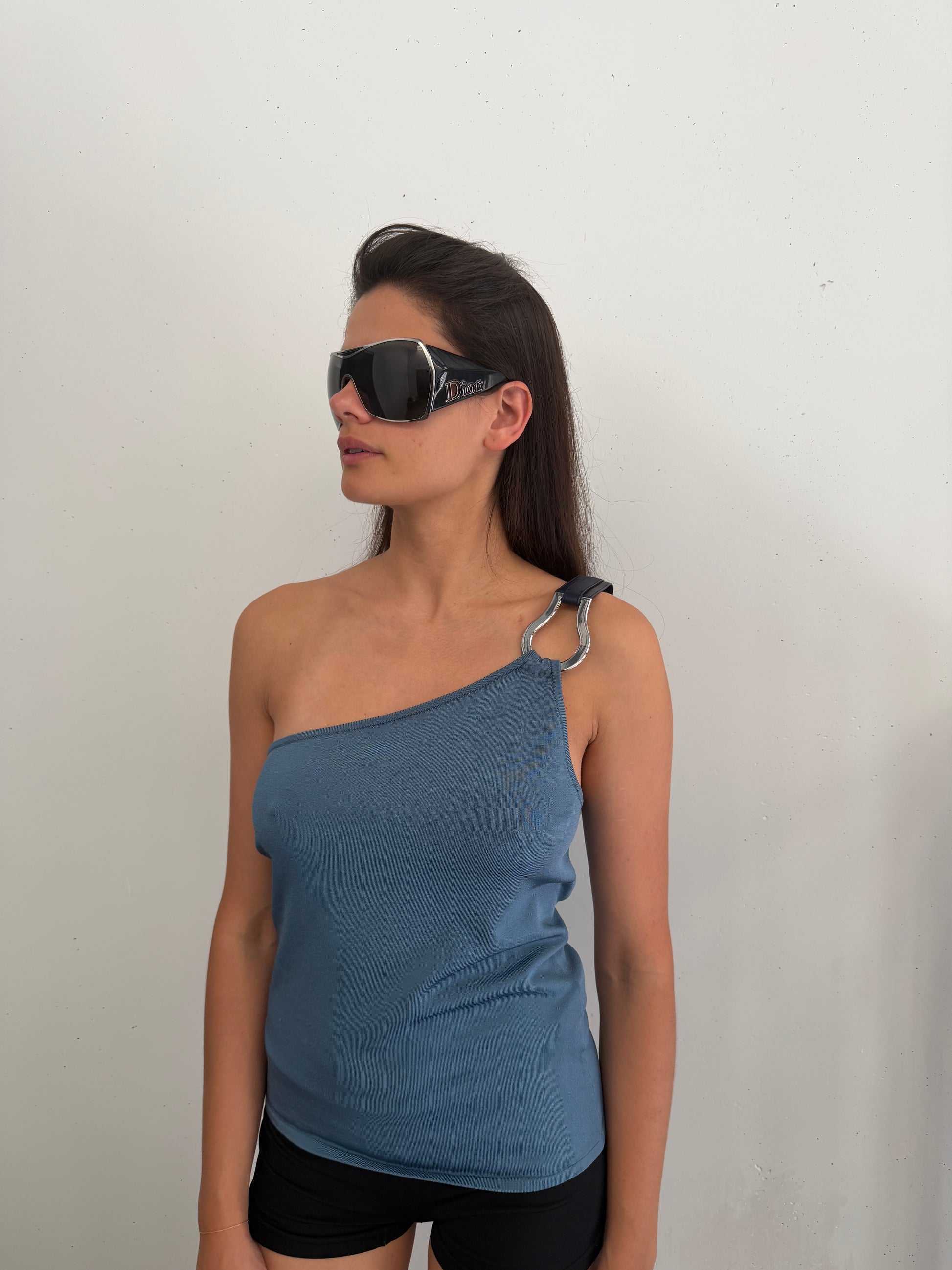 > RALPH LAUREN ONE SHOULDER SILVER/LEATHER HARDWARE TOP